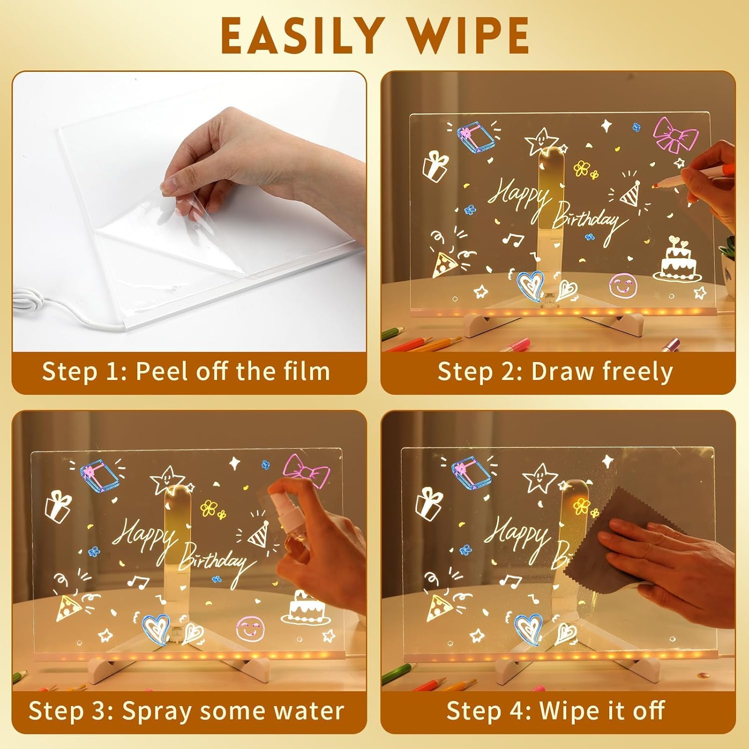 Simply write using the included pen, switch on the light, and enjoy the beautiful 3D glow. Wipe clean anytime and start fresh—no paper waste, no hassle.